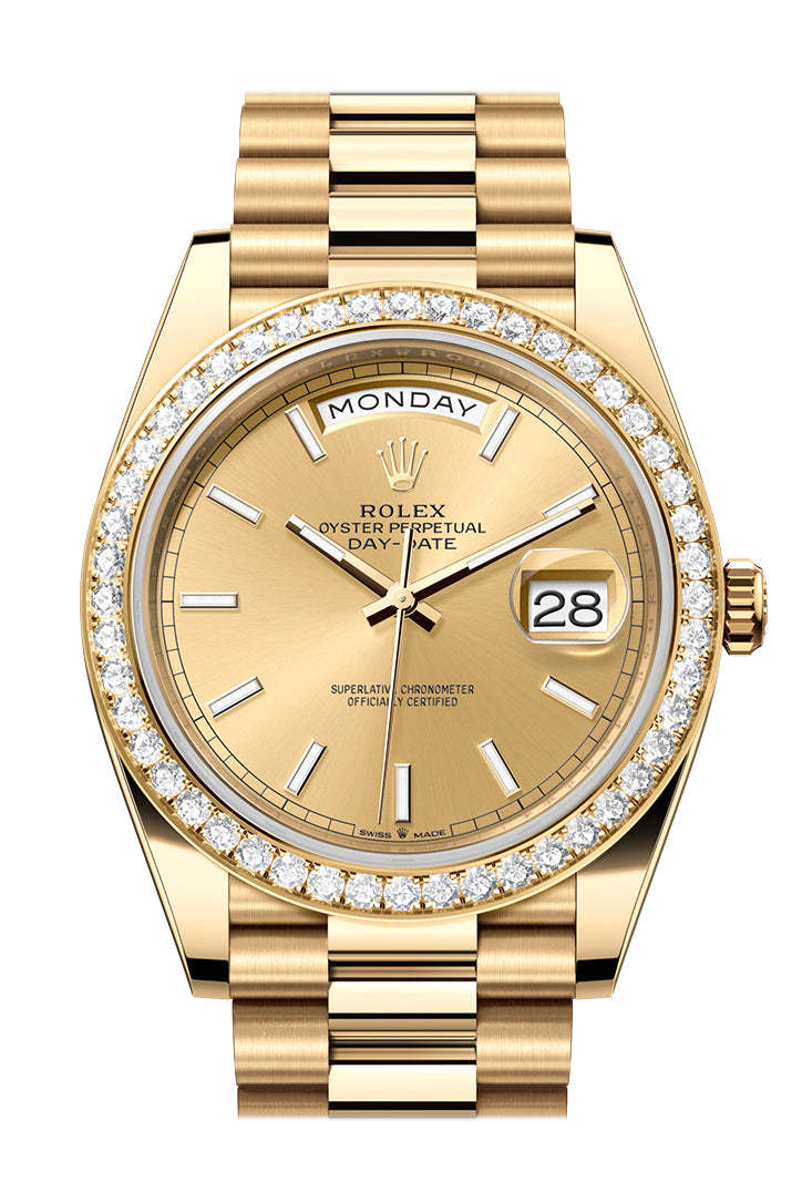 Yellow gold case with a 18kt yellow gold president bracelet. Fixed bezel with diamond set.Champagne dial with yellow gold hands and Indexnumeral hour markers. Dial Type: Analog. Date display at the 3 o'clock position. Calibre 3255 Automatic movement, based upon 3035, containing 31 Jewels, bitting at 28800 vph, and has a power reserve of approximately 70 hours. Scratch resistant sapphire crystal. Screw down crown. Solid case back. Round case shape, case size: 40 mm. Concealed folding crown clasp. Water resistant at 100 meters / 330 feet. Functions: date, day, hour, minute, second. Day-date 40 Series. Luxury watch style. Watch label: Swiss Made. Day-Date 40 Automatic BrightChampagne Dial Men's 18kt Yellow Gold President Men's Watch228348228348RBR 228348RBR-0008