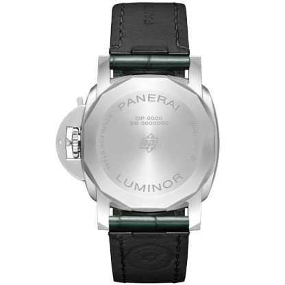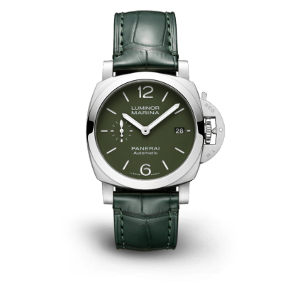 Military green with luminous Arabic numerals and hour markers. Date at 3 o'clock and small seconds at 9 o'clock