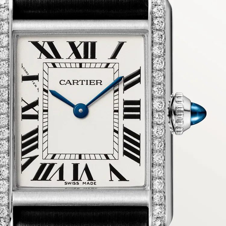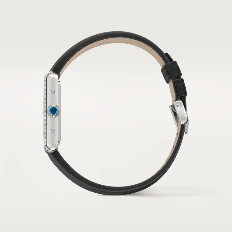 Luxuriously refined in stainless steel with a diamond-set bezel, this small Tank Must features a black leather strap for a sleek finish.