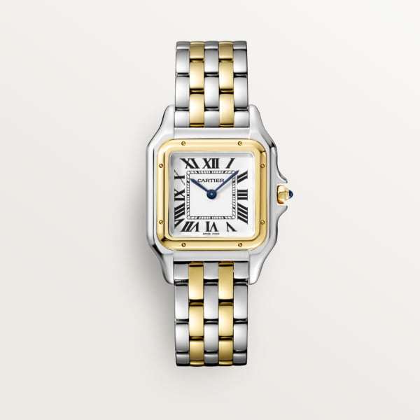 ?Panther Small 2-Tone Steel & Gold Panthere Watch 4023 - Quartz. Stainless steel case with 18k yellow gold bezel (29mm x 37mm). White colored dial with black Roman numerals. Stainless steel Panthere bracelet with 2-row of 18k yellow gold links; will fit a 5 3/4 inch wrist . Pre-owned with custom box.