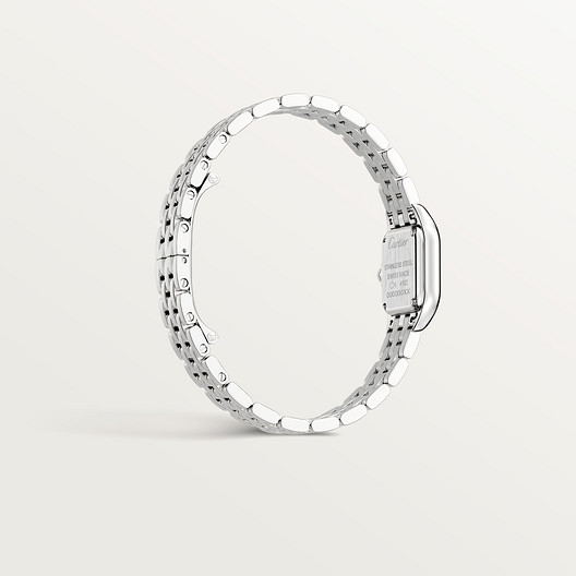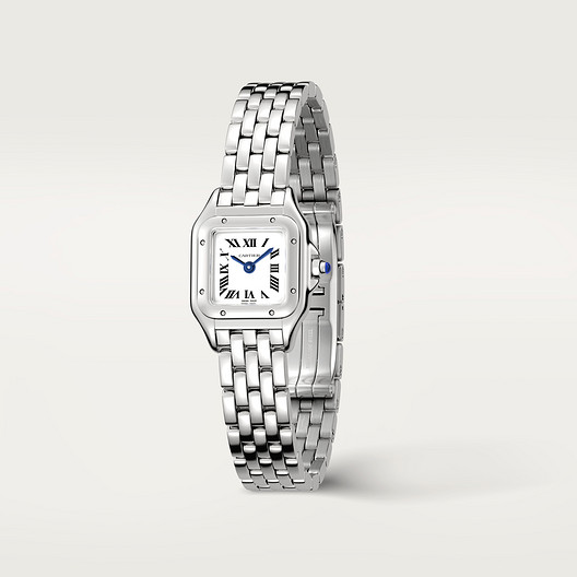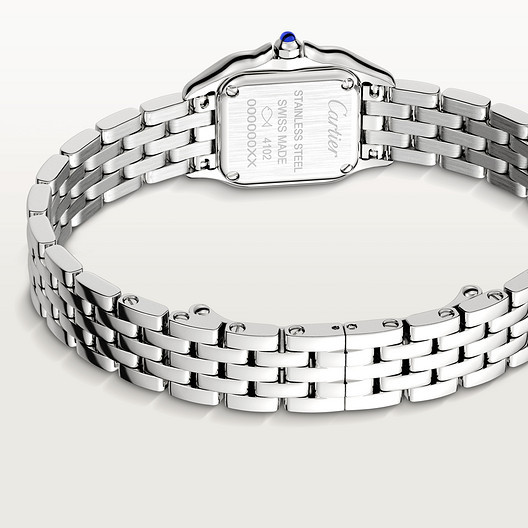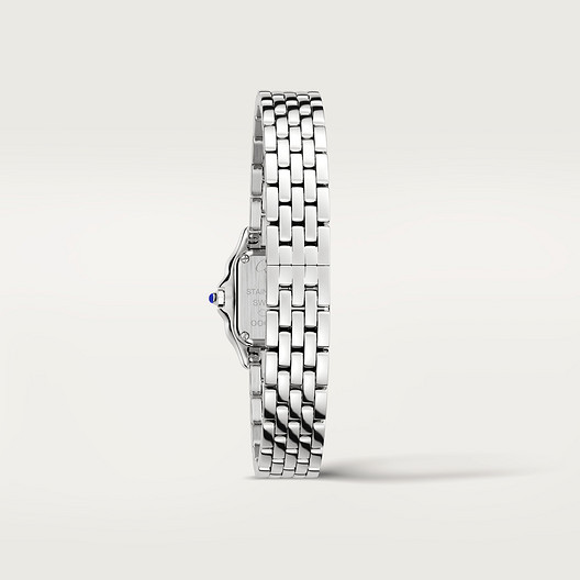 Panth??re de watch, mini model, quartz movement. Steel case and bracelet. Octagonal crown set with a blue synthetic spinel. Silvered dial, blued-steel sword-shaped hands, sapphire crystal. Dimensions: 25 mm x 21 mm, thickness: 6 mm. Water-resistant to 3 bar (approx. 30 metres).