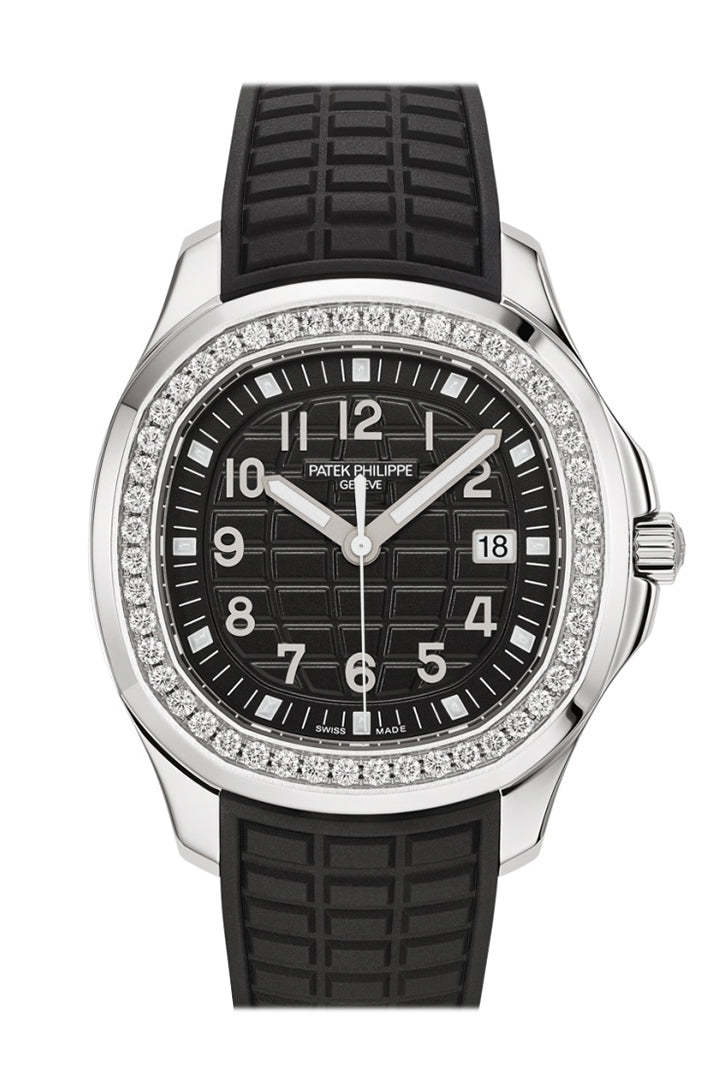 Sweep seconds.Black, embossed with Aquanaut pattern, gold applied numerals.