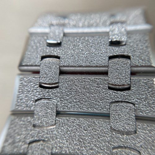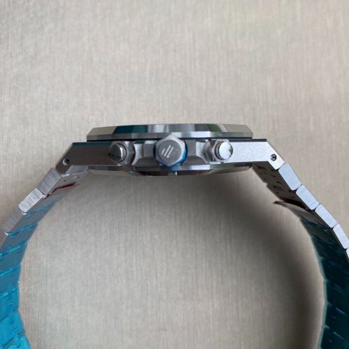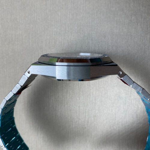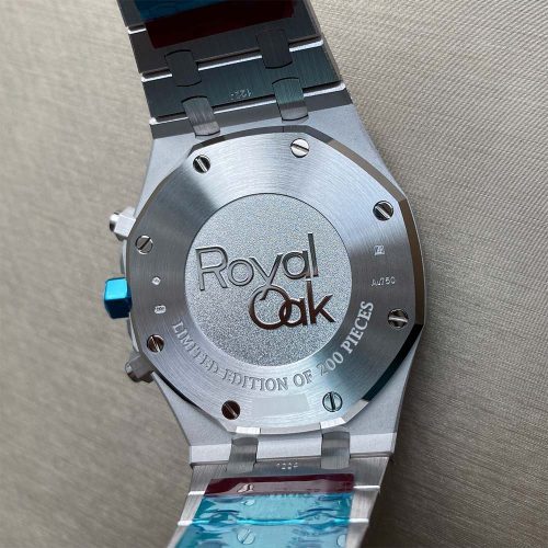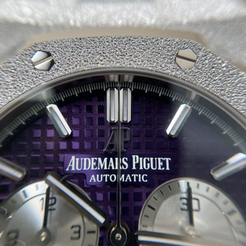 Plum purple dial with ??Grande Tapisserie?? pattern, rhodium-toned counters, white gold applied hour-markers and Royal Oak hands with luminescent coating.