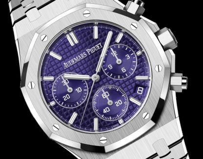 Purple dial with ??Grande Tapisserie?? pattern, purple counters, white gold applied hour-markers and Royal Oak hands with luminescent coating.