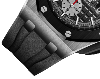 Black dial with ??M??ga Tapisserie?? pattern, rhodium-toned counters, white gold applied hour-markers and Royal Oak hands with luminescent coating, slate grey inner bezel.