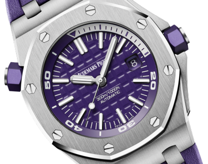 Purple dial with ??M??ga Tapisserie?? pattern, white gold applied hour-markers and Royal Oak hands with luminescent coating, purple rotating inner bezel with zone from 60 to 15 minutes in white.
