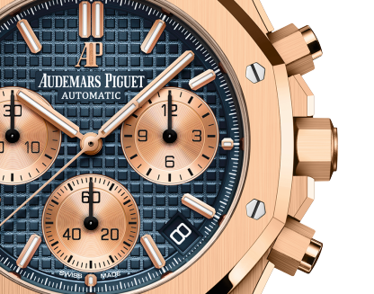 Blue dial with ??Grande Tapisserie?? pattern, pink gold-toned counters, pink gold applied hour-markers and Royal?Oak hands with luminescent coating