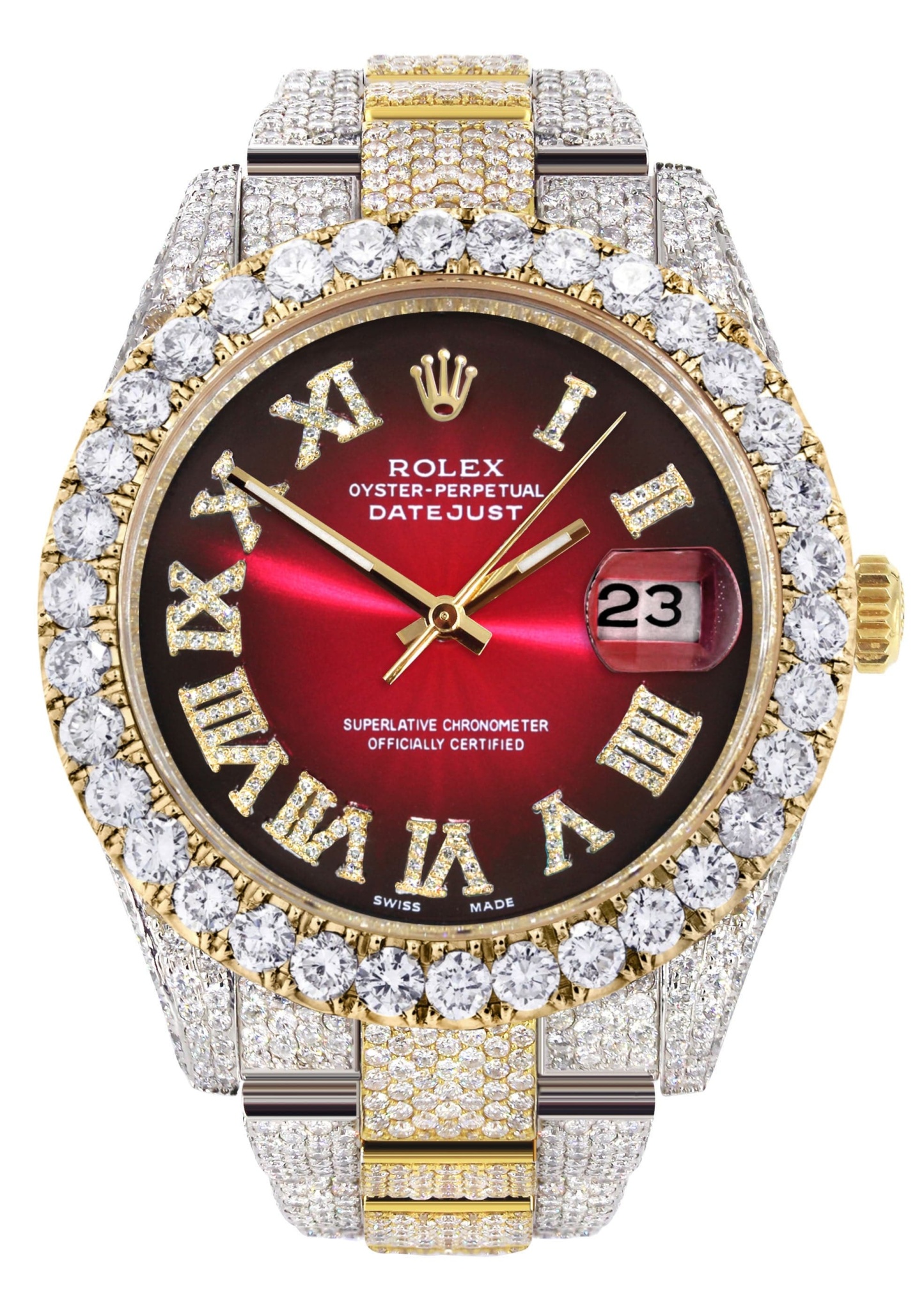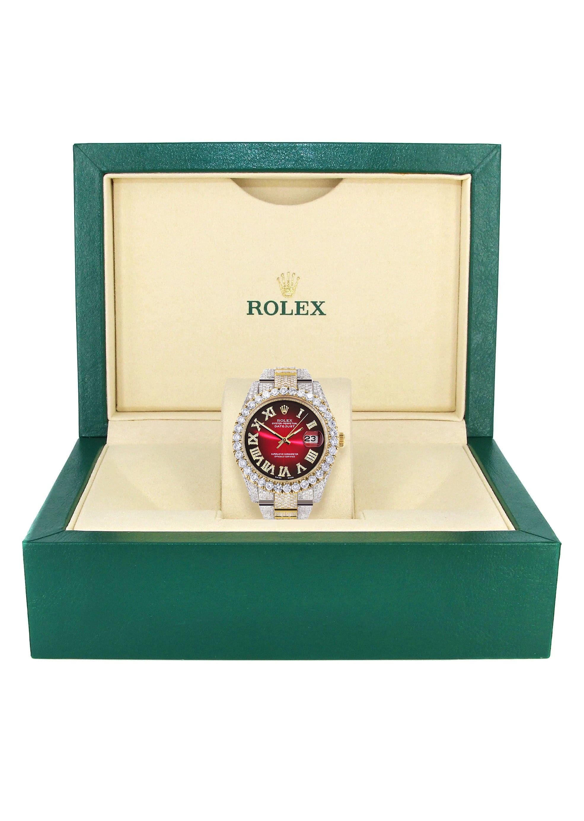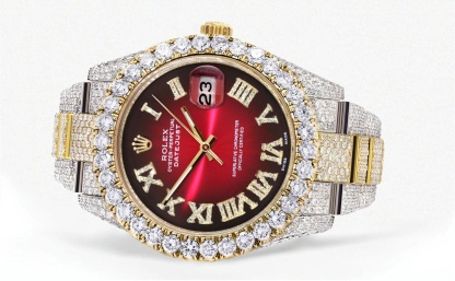 Diamond Iced Out rothtlex Datejust 41 | 25 Carats Of Diamonds | Custom Red Black Roman Numeral Dial | Two Tone | Oyster Band