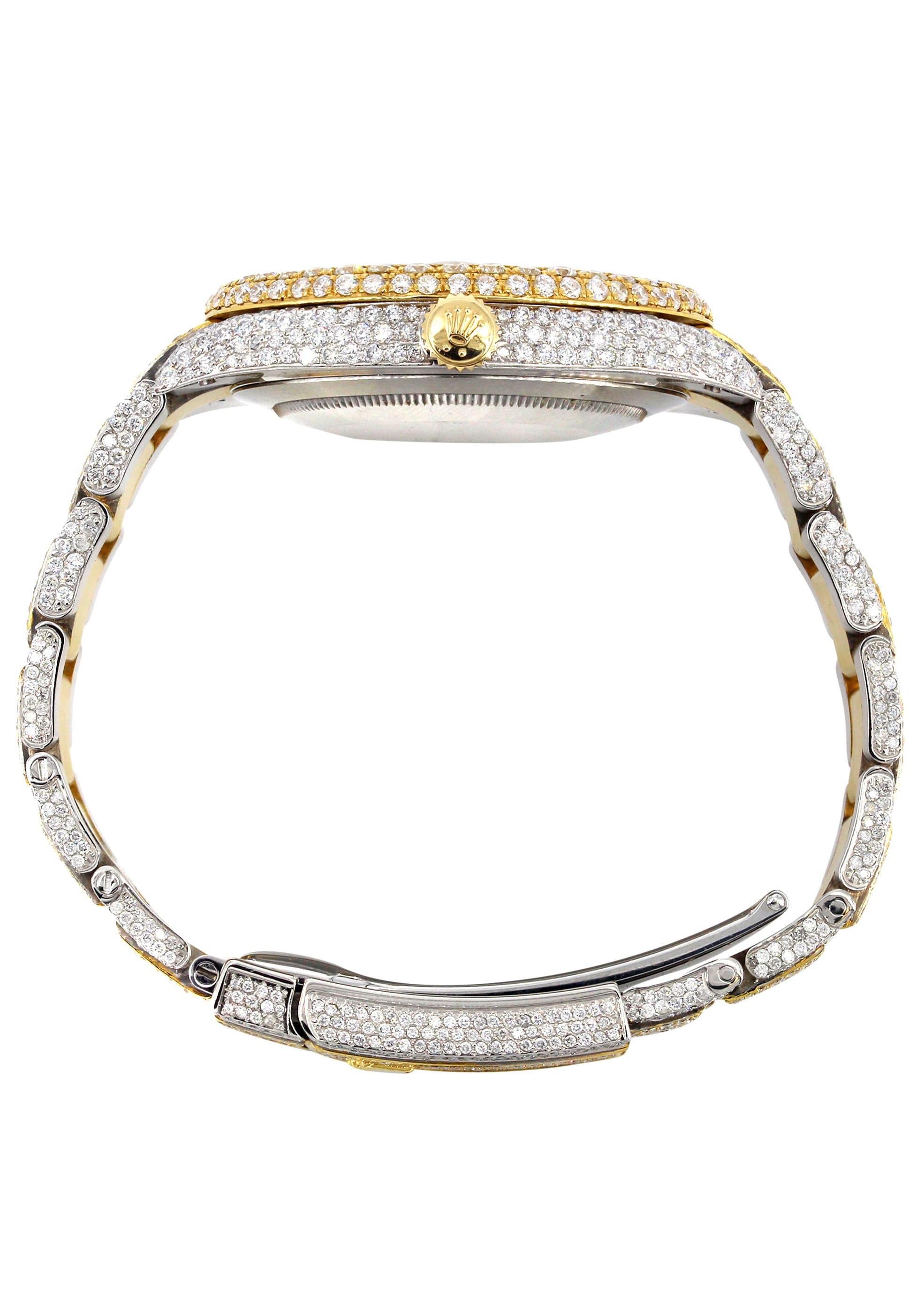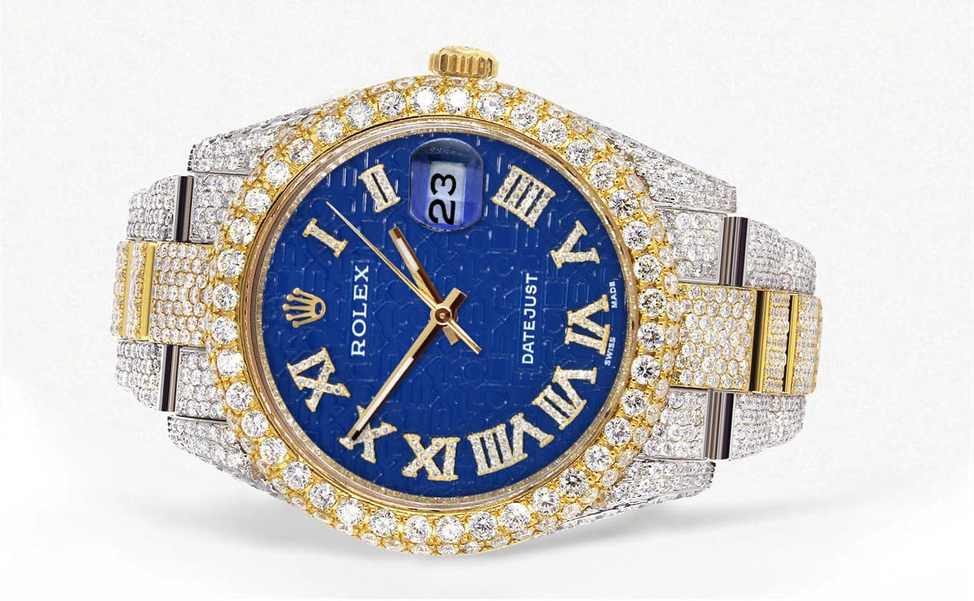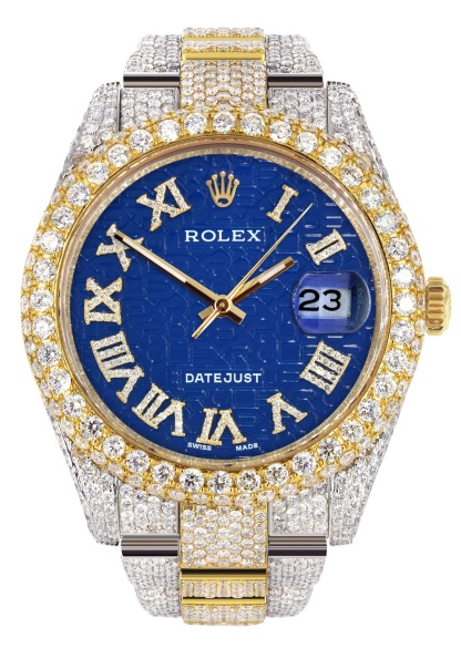 Diamond Iced Out Rothtlex Datejust 41 | 25 Carats Of Diamonds | Blue Text Pattern Dial | Two Tone | Two Row | Oyster Band