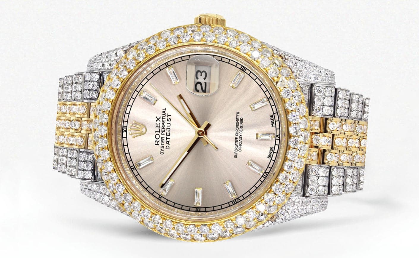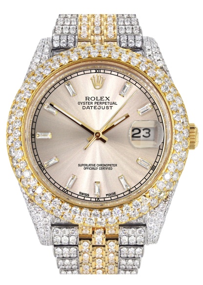 Diamond Iced Out Rothtlex Datejust 41 | 25 Carats Of Diamonds | Custom Dawn Pink Dial | Two Tone | Two Row | Jubilee Band