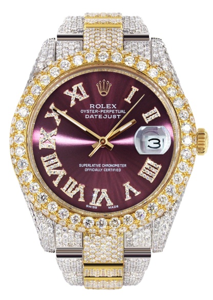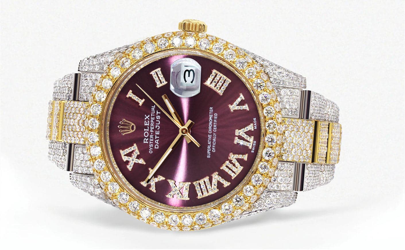 Diamond Iced Out Rothtlex Datejust 41 | 25 Carats Of Diamonds | Purple Roman Numeral Dial | Two Tone | Two Row | Oyster Band