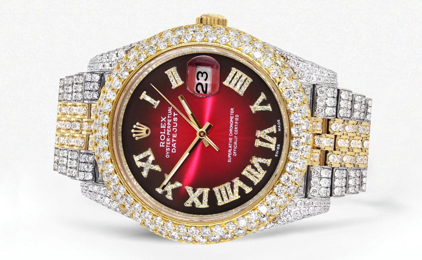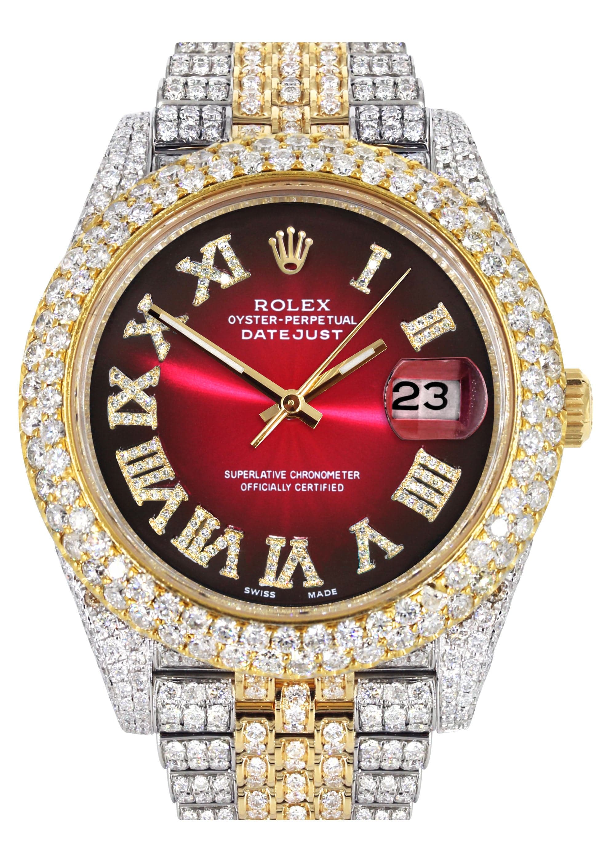 Diamond Iced Out Rothtlex Datejust 41 | 25 Carats Of Diamonds | Red Black Dial | Two Tone | Two Row | Jubilee Band