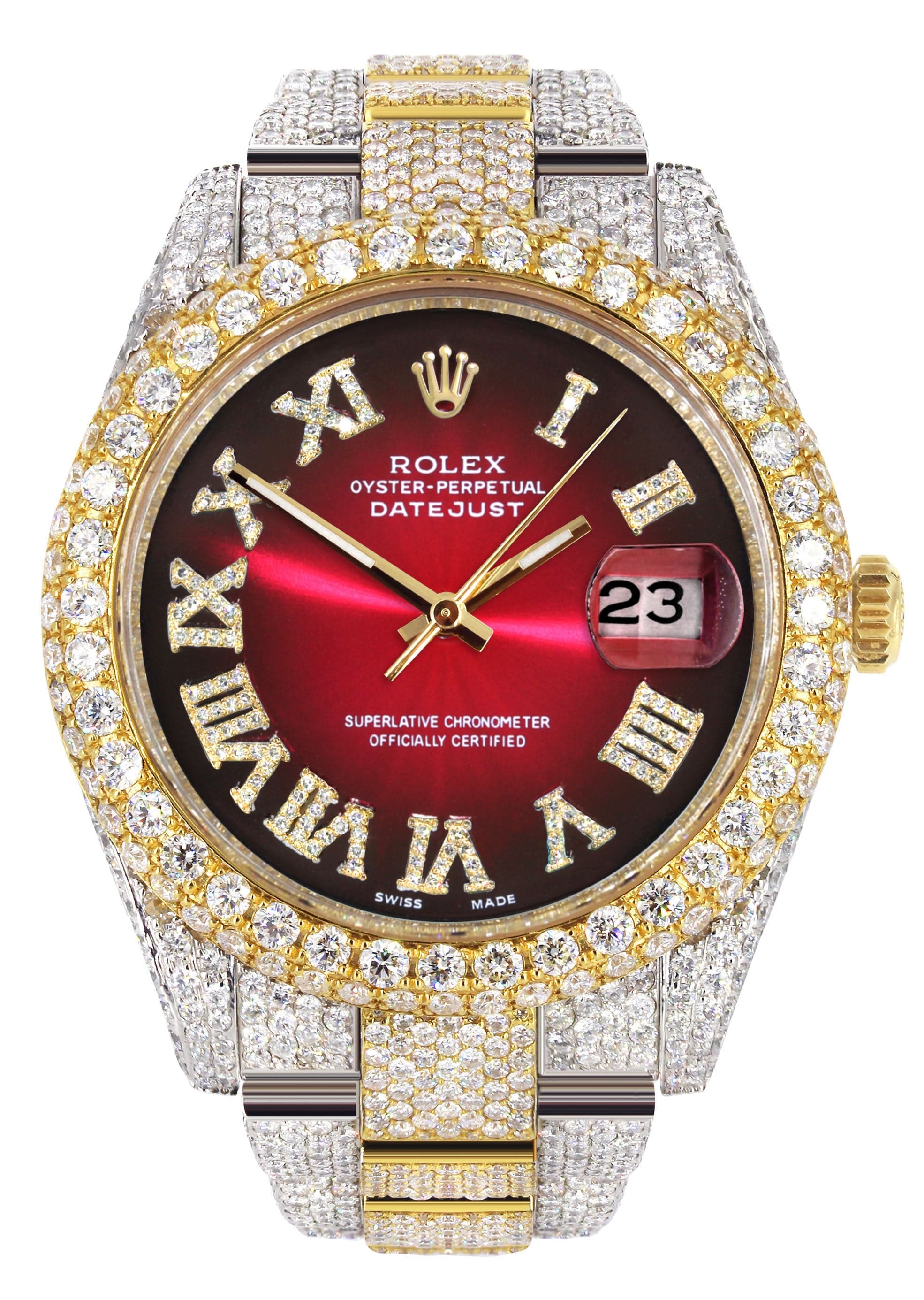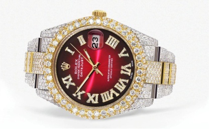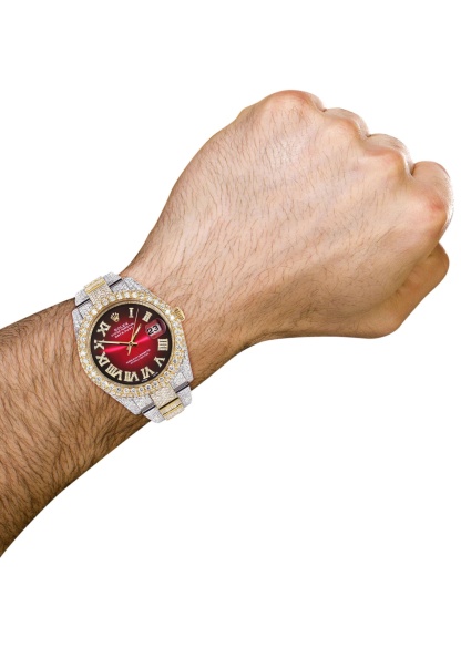 Diamond Iced Out Rothtlex Datejust 41 | 25 Carats Of Diamonds | Red Black Roman Numeral Dial | Two Tone | Two Row | Oyster Band