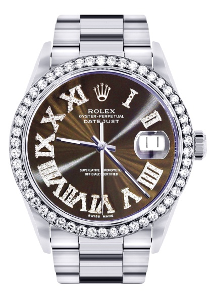 Diamond Mens Rothtlex Datejust Watch 16200 | 36Mm | Custom Dark Brown Roman Numeral Dial | Oyster Band