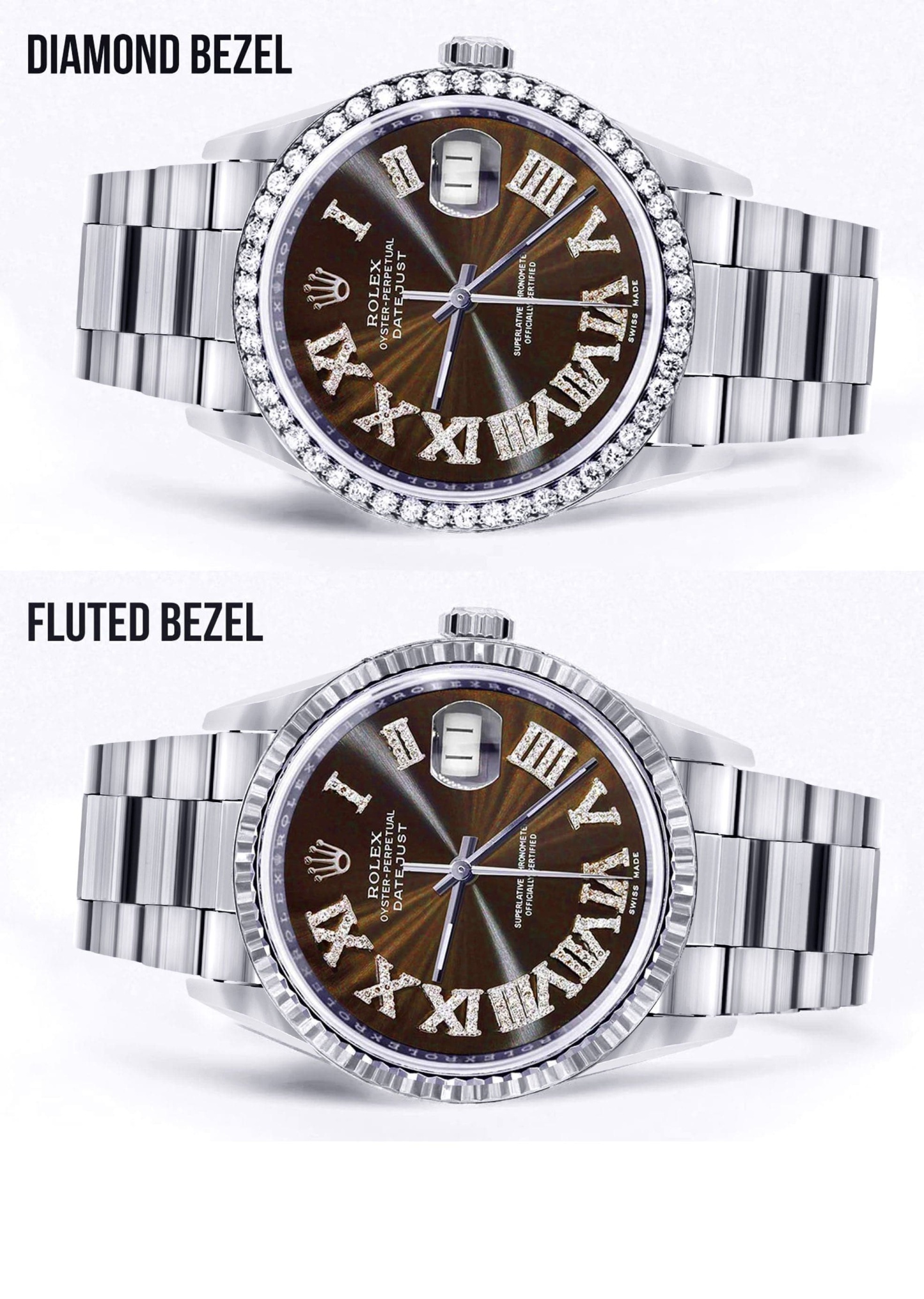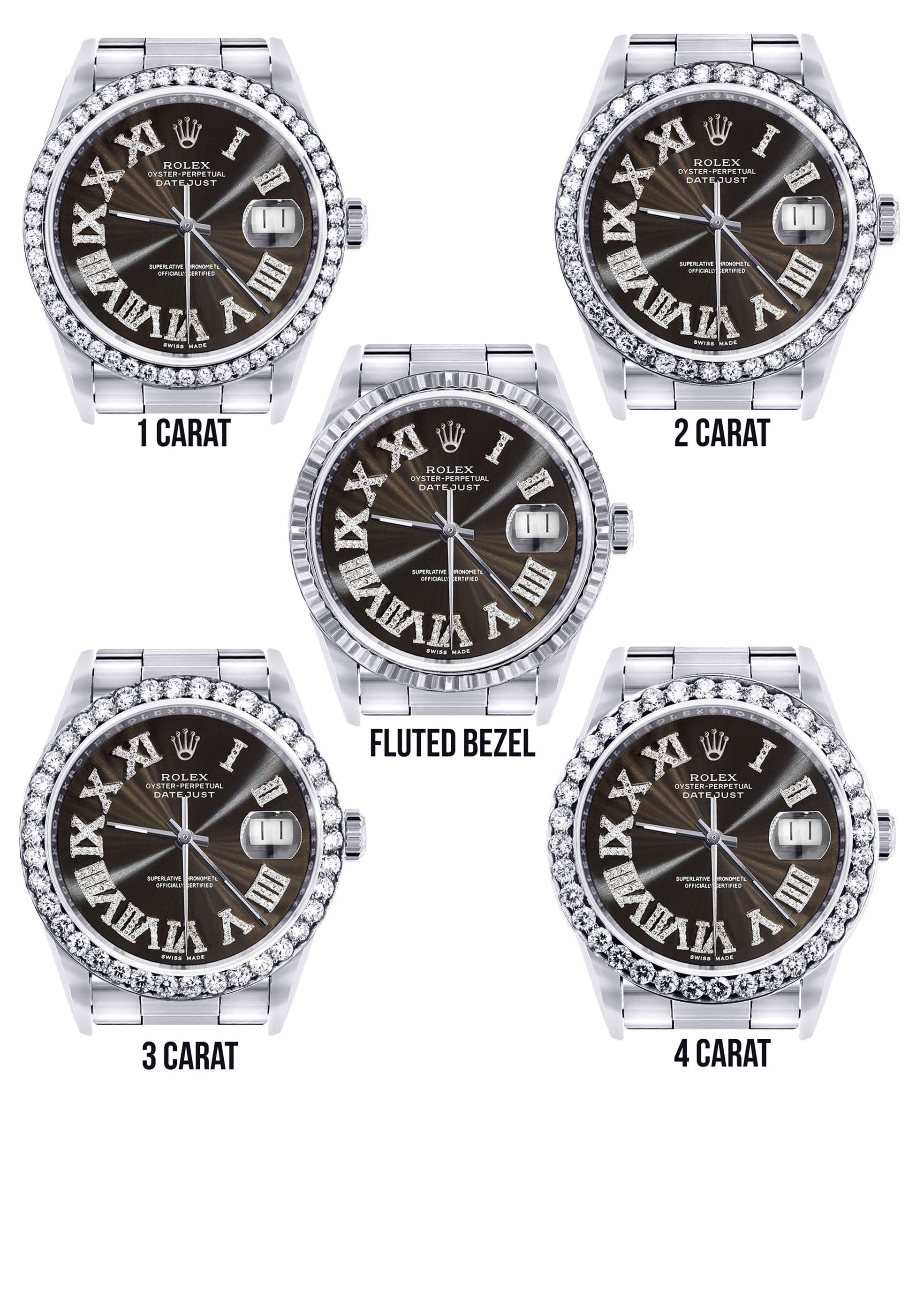 Rothtlex Datejust 36MM with a Oyster Band. Customizable Diamond Bezel From 1.00-4.00 Carat. Below are more details of the watch.
