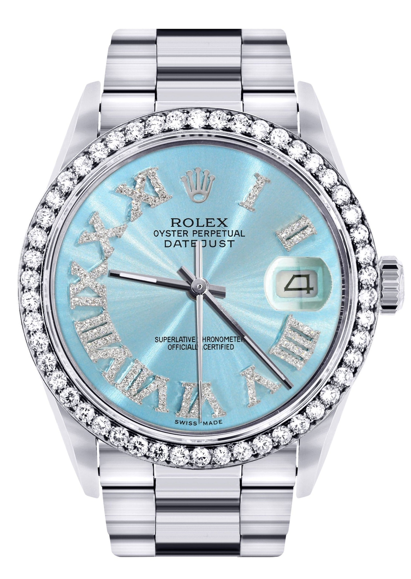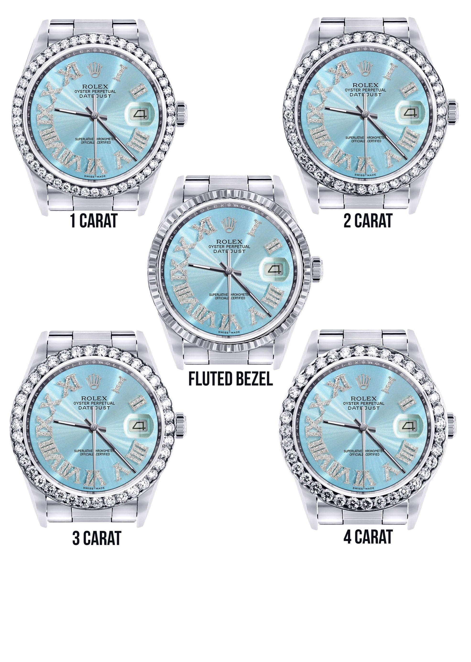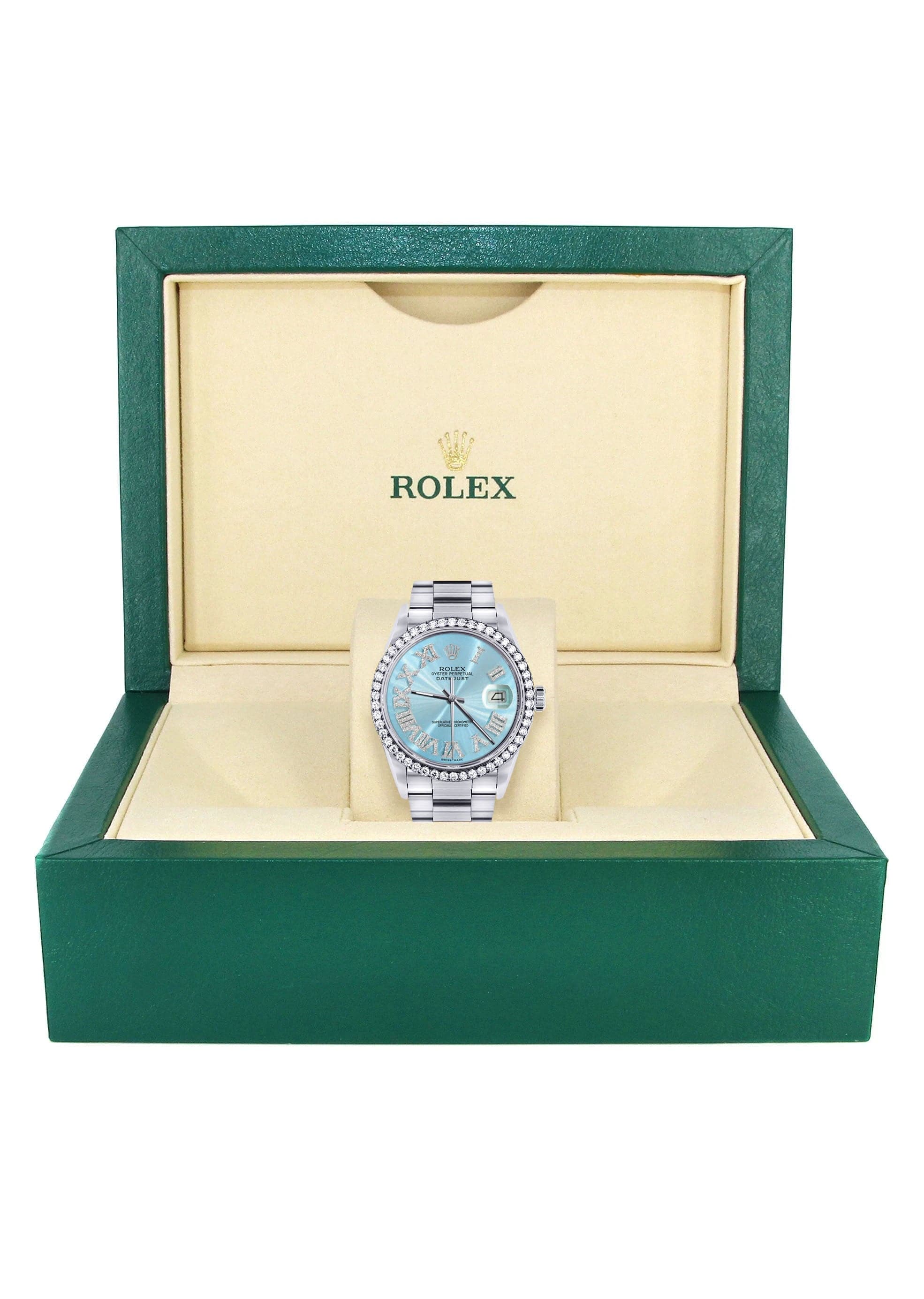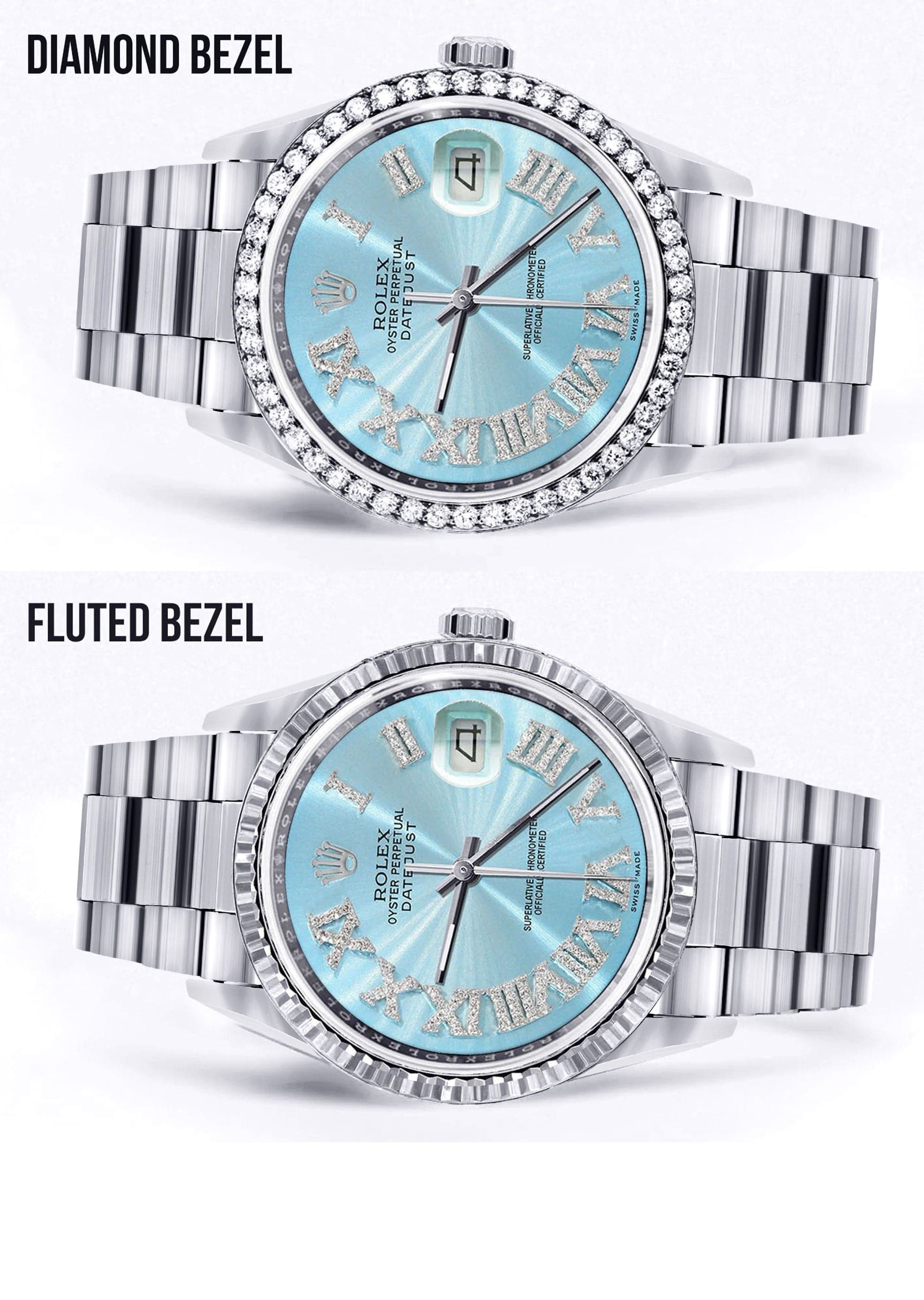 Rothtlex Datejust 36MM with a Oyster Band. Customizable Diamond Bezel From 1.00-4.00 Carat. Below are more details of the watch.