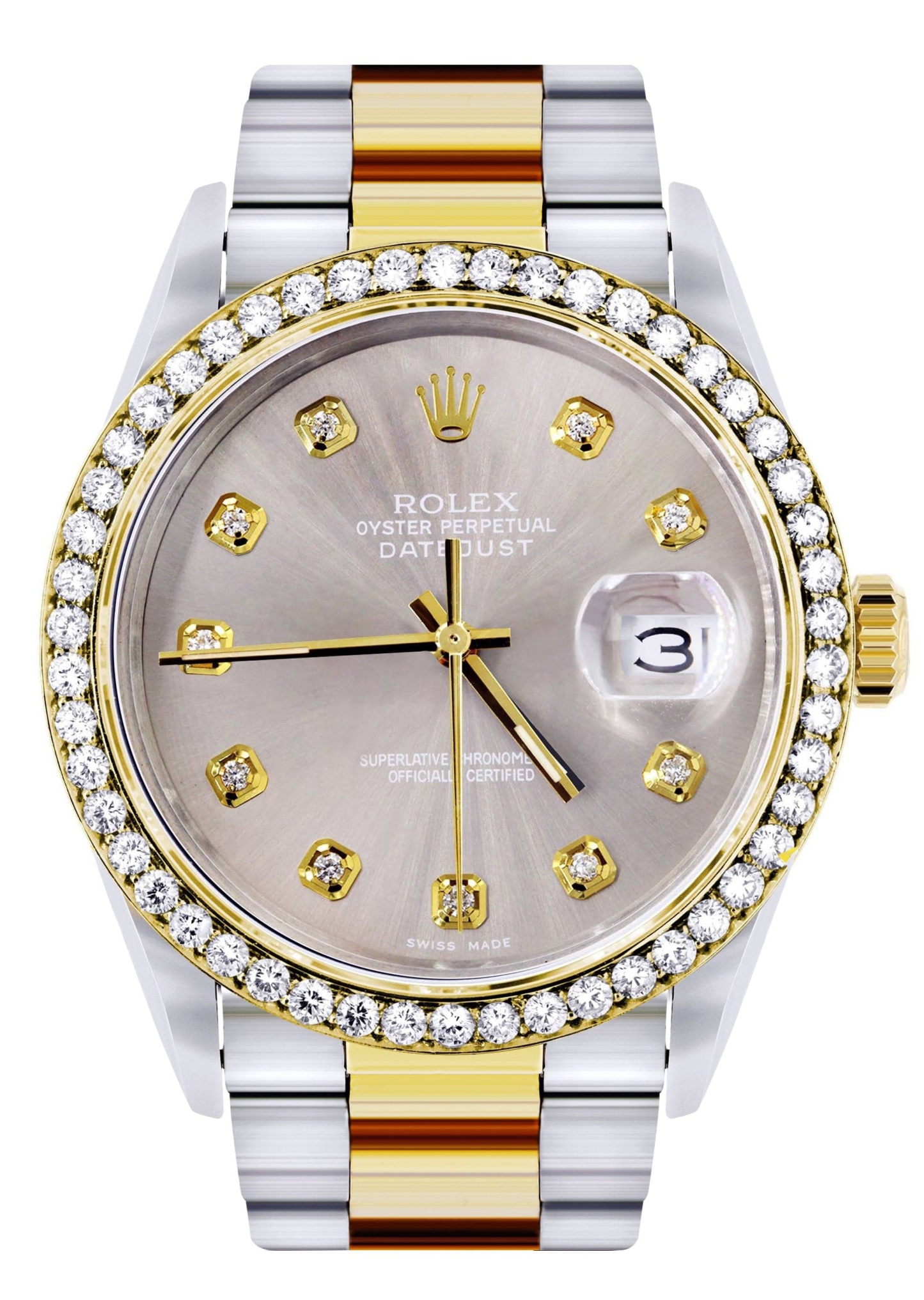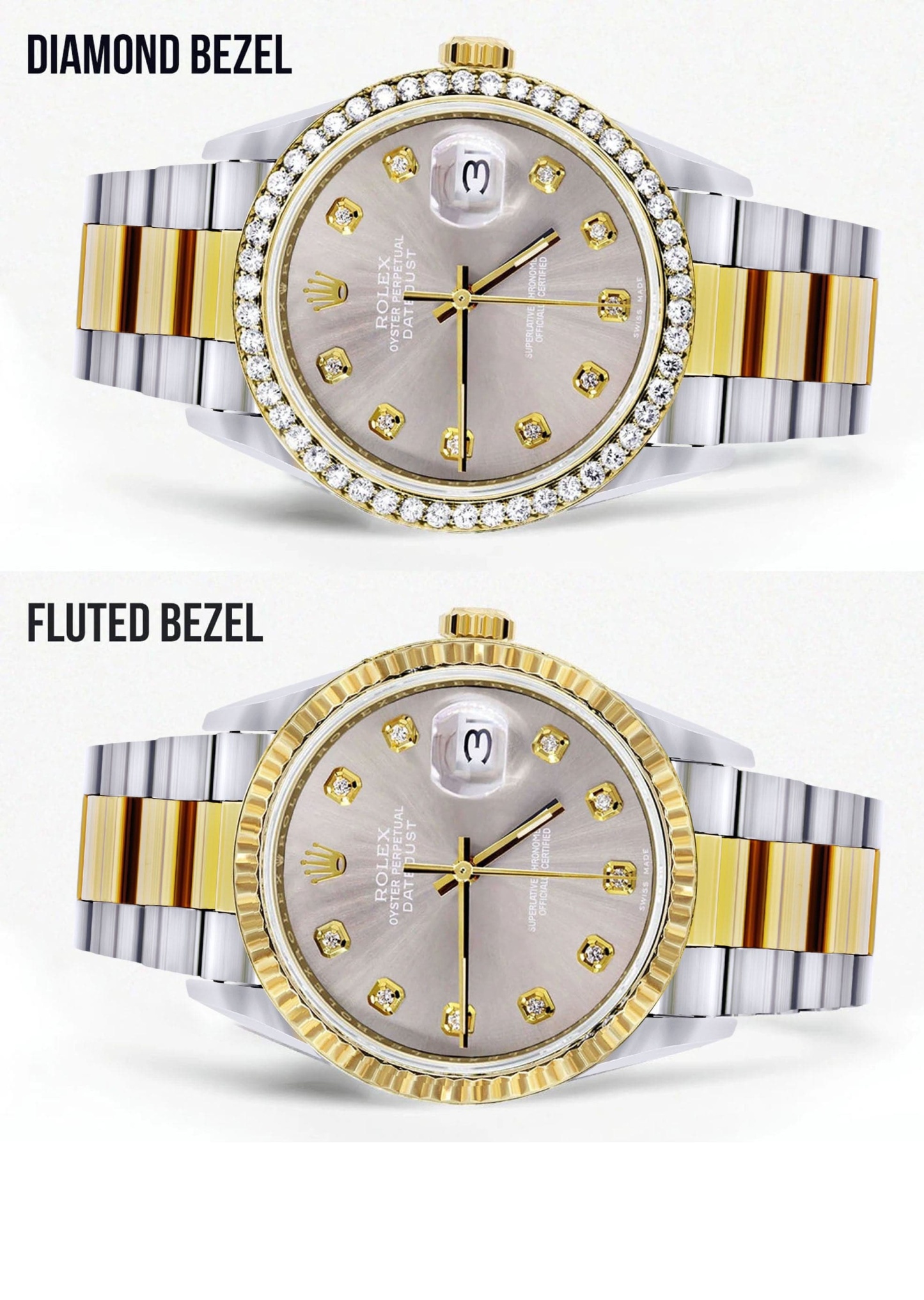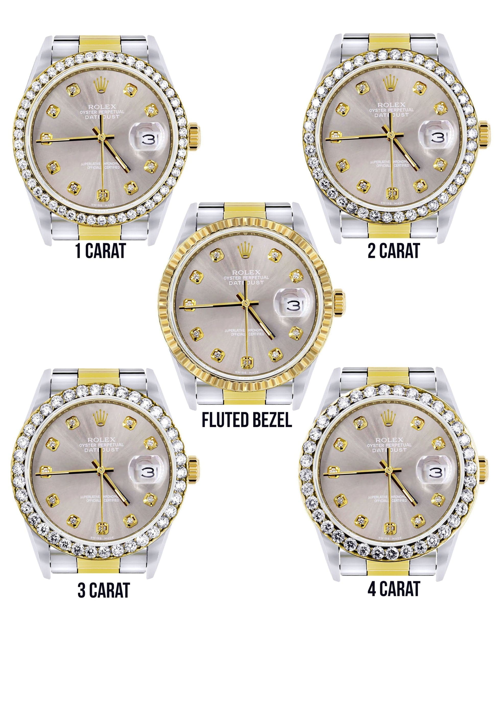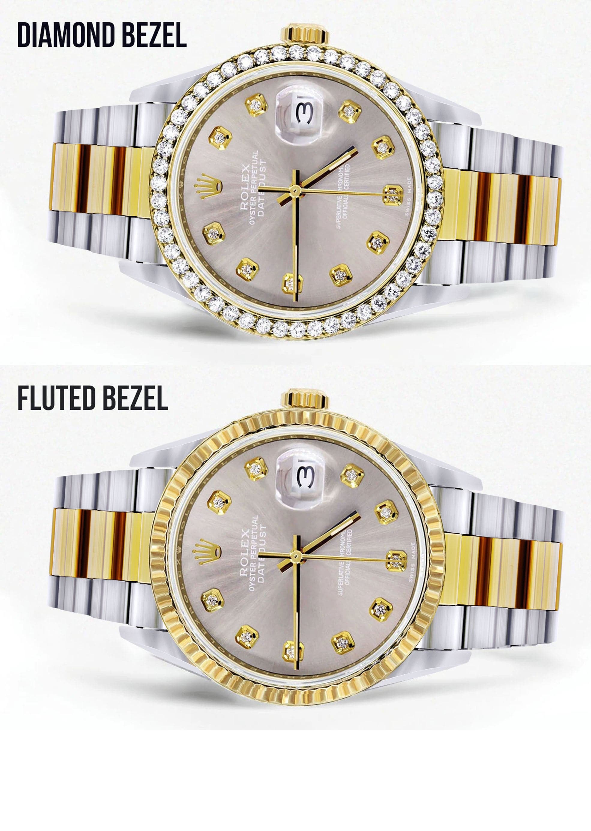 Rothtlex Datejust 36MM with a Oyster Band. You can customize the bezel type between Gold Fluted Bezel or Diamond Bezel ranging from 1.00-4.00 carat. Below are more details of the watch.