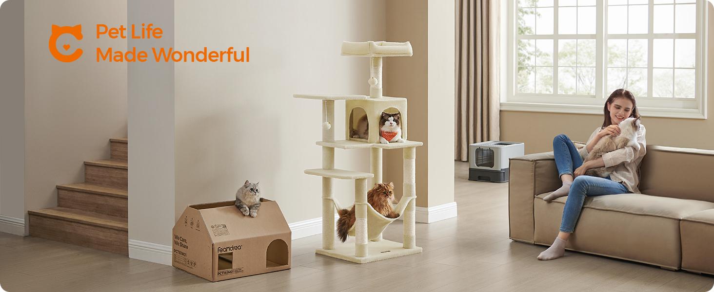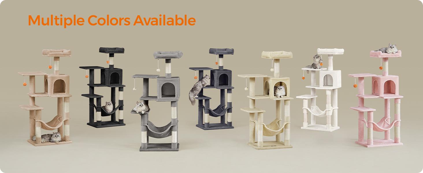 [Ideal height: 56.3" tall for cats who love to climb to high spaces and observe the house., Stable and safe: Quality materials, a reinforced base, and an anti-tip kit ensure a stable and safe place for your cats to jump up and down., Soft and comfortable: The cat climbing tree is covered with soft plush for soothing coziness., A variety of fun: With 2 pompoms, 1 cave, 2 perches, and a hammock, your cats won’t get bored on this cat play tower., Protects your furniture: 4 scratching posts entertain the restless claws to prevent them from ruining your furniture., Friendly to kittens and elderly cats: The multi-level design makes it easier to climb.]