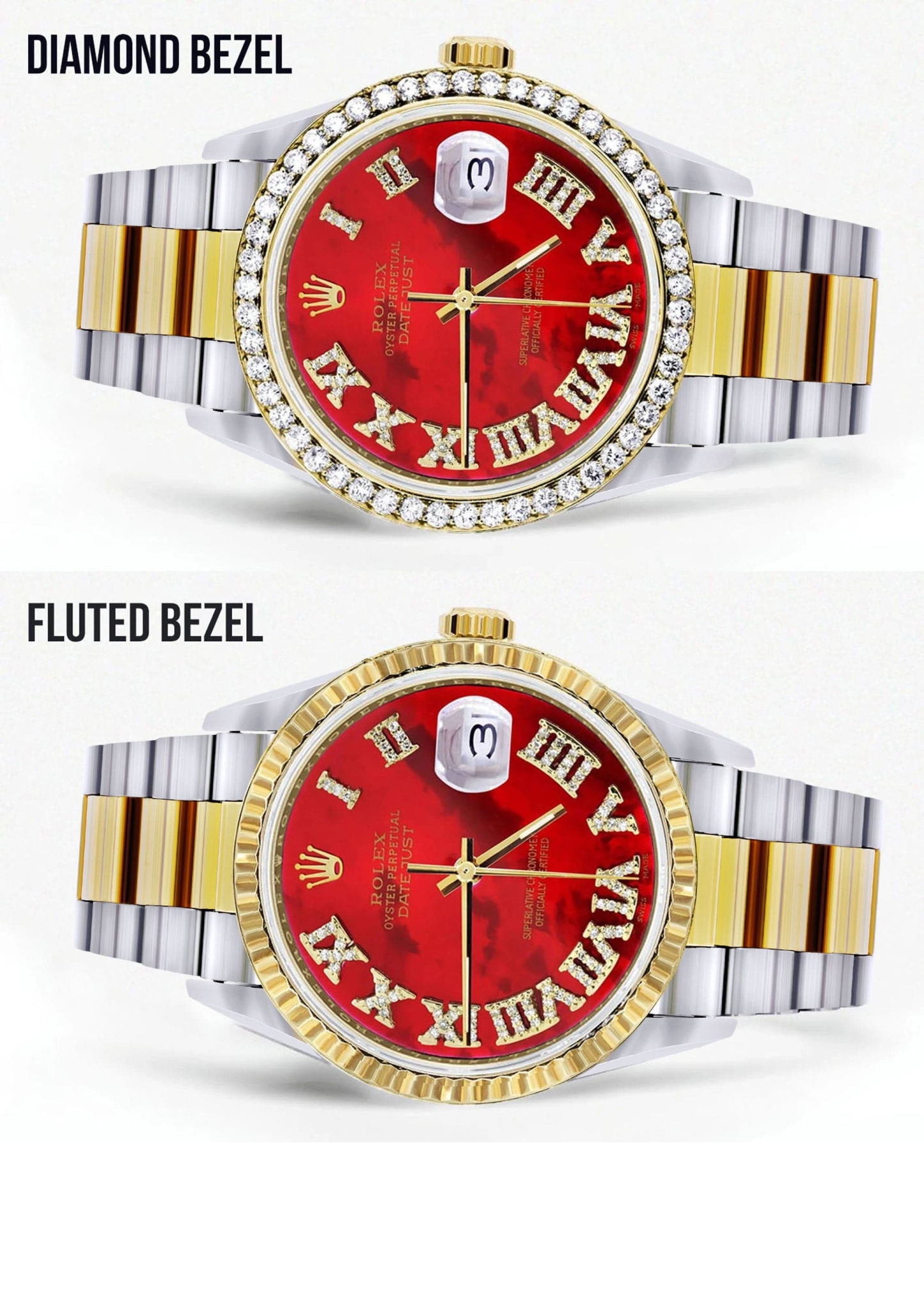 Rothtlex Datejust 36MM with a Oyster Band. Customizable Diamond Bezel From 1.00-4.00 Carat. Below are more details of the watch.
