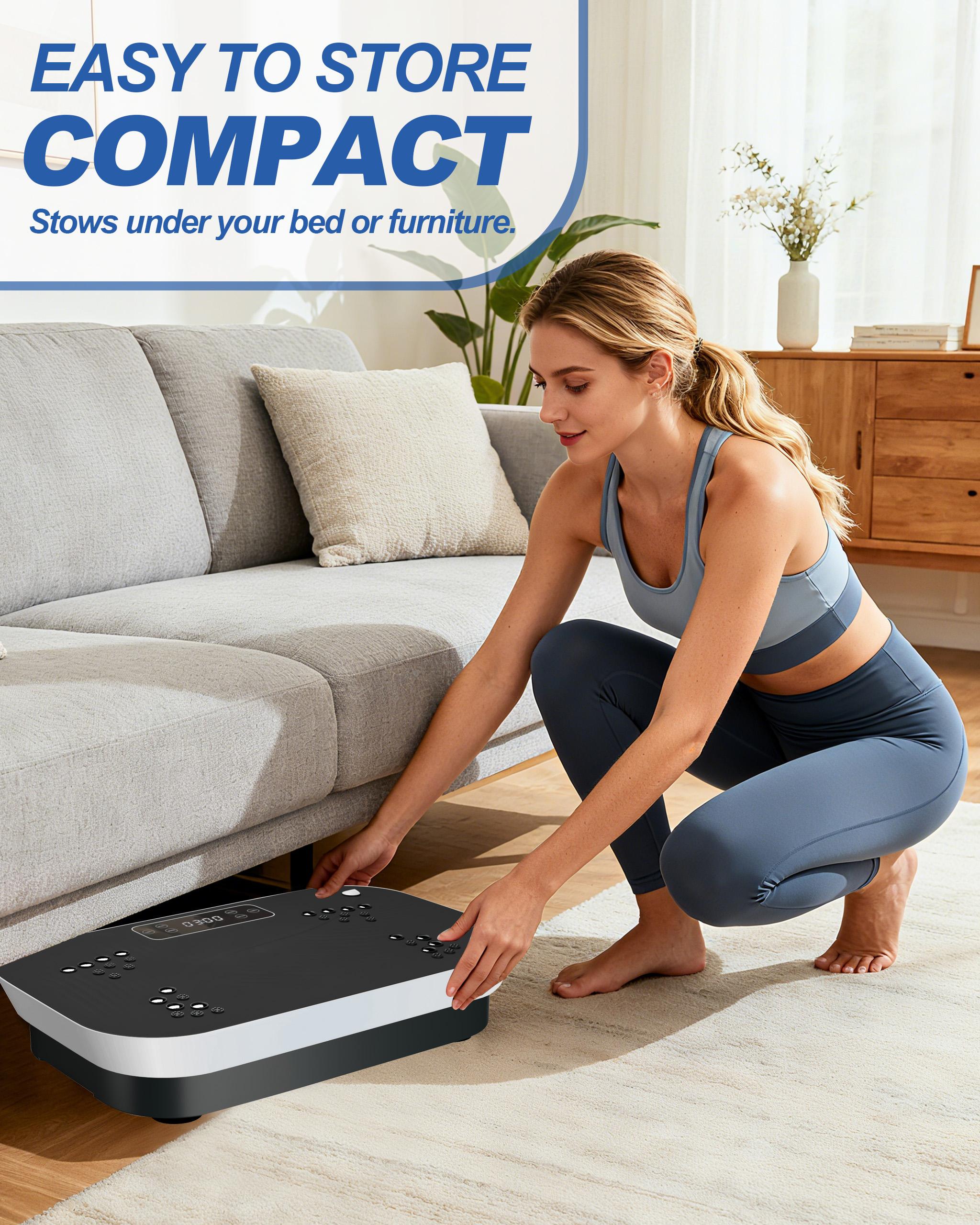 [【ABS Materials】 The vibration board, built with durable ABS material, supports up to 300 lbs. Four suction cups ensure stability and safety during workouts. Designed for quiet operation, it won’t disturb your household. Its compact design saves space and fits anywhere. Dimensions: 25" L x 14" W x 6" H. , 【RELIEF REHABILITATION REPAIR】The vibration platform machines delivers efficient and gentle Whole Body Vibrations, waking muscles throughout the body and increasing blood flow in the muscles. This enhances your body’s built-in ability to regenerate cells and repair itself. Relief is felt from the first use, continued and regular use builds up muscle tone, protecting nerves and bones., 【BUILD YOUR DREAM BODY】Jump on your vibrating exercise machine to instantly sculpt your ideal body!The system creates a full-body vibration that stimulates muscles - causing extra muscle contraction and increased activation.This kind of machine helps in maintaining reflex reactions, thus burning calories., 【Ideal for Home Fitness】Compact and portable, the vibration plate exercise machine fits easily into any space and can be stored effortlessly after use, making it the perfect fitness solution for busy lifestyles and small homes.It is a gift for family and friends for Mother's Day gift.April Restock Campaign.]