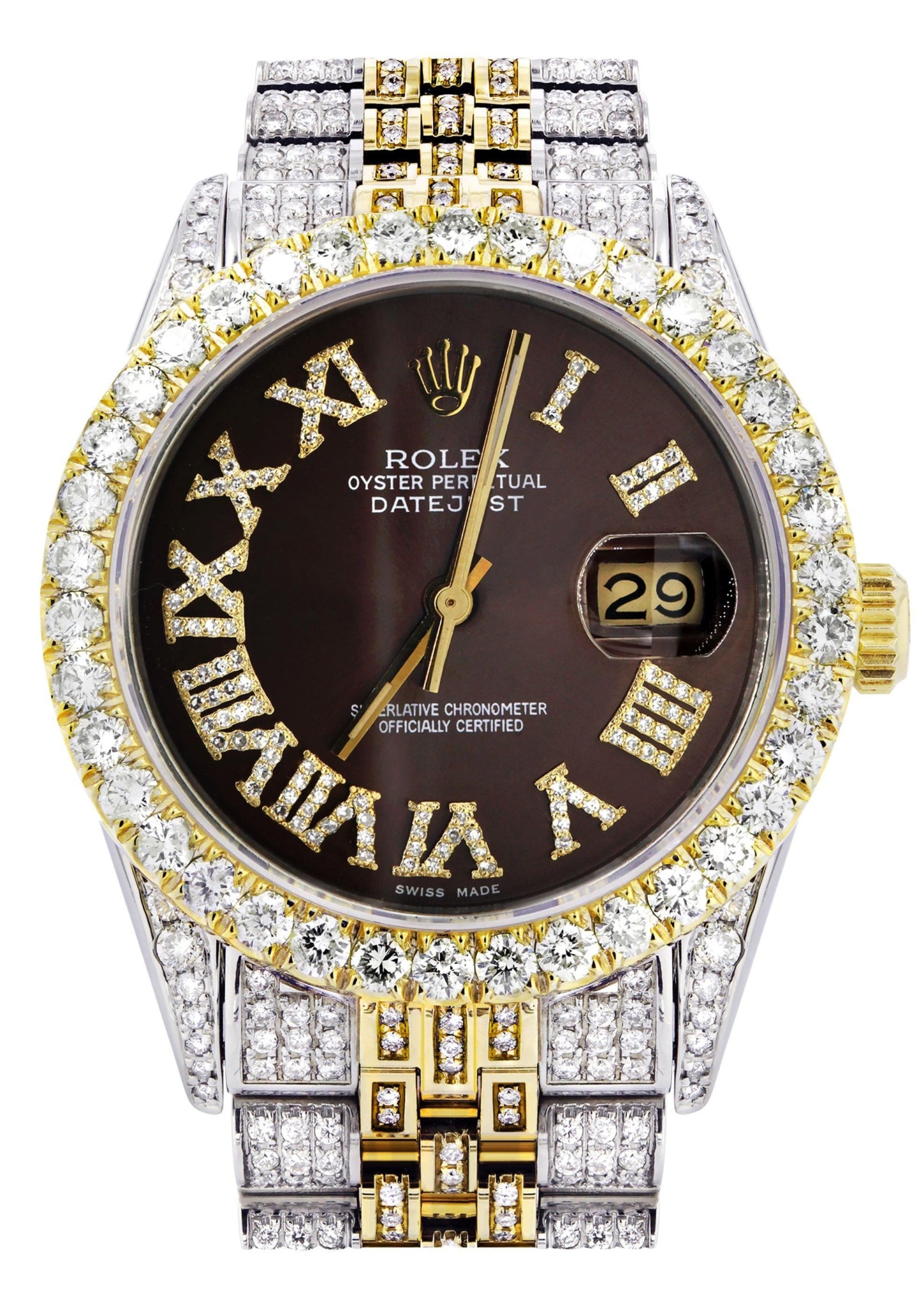 Iced Out Rothtlex Datejust 36 MM | Two Tone | 10 Carats of Diamonds | Chocolate Roman Diamond Dial