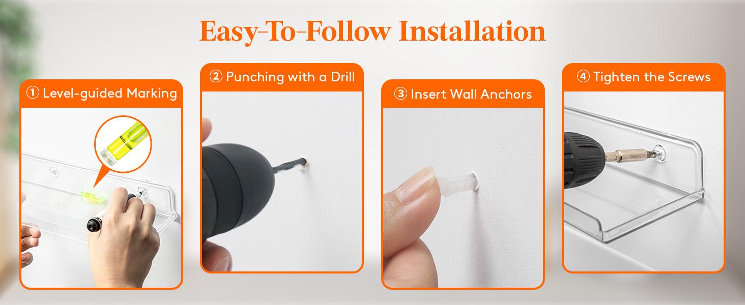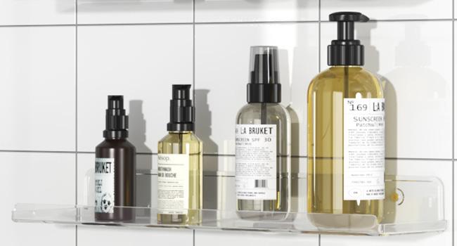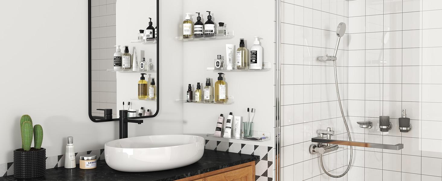 [Material: Acrylic, Design: Front and side lips to prevent items from falling off, Installation: Two hanging options (upward or downward), pre-drilled holes, Cleaning: Easy to clean with a microfiber or mild cloth]