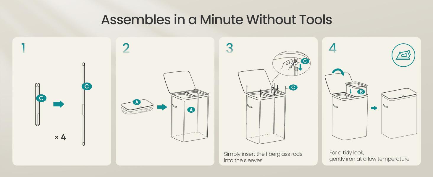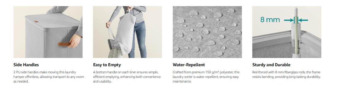 [Convenient for Sorting Laundry: Features 2 compartments with "Light" and "Dark" labels on the frame., Easy to Assemble: No tools required; simply insert the 4 fiberglass rods., Spacious: Measuring 22"L x 15.7"W x 29.5"H, it offers 44.9 gallons of space., Easy to Move and Empty: Equipped with handles on the basket body, inner bag, and bottom of the bag., With Lid: Protects clothes from dust and ensures your privacy., Premium Material: Made from thick, water-repellent polyester fabric (150 g/m²), easy to clean.]