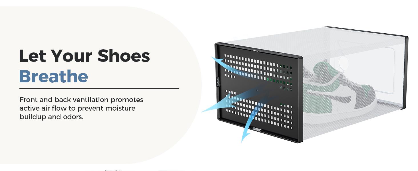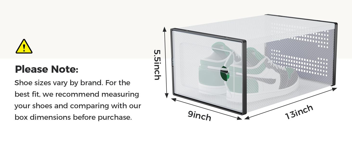 [【Stackable Design】 Featuring secure interlocking connectors, these boxes stack vertically in two simple steps: "INSERT and SLIDE." Lift one box to move the whole column smoothly. The stable structure saves space while preventing collapses., 【Two Sizes Available】 Offering Large (13"L × 9"W × 5.5"H) and X-Large (13.4"L × 10"W × 6.5"H) options. The Large size fits men's US 9/women's US 10, while the X-Large accommodates up to men's US 11/women's US 12. Perfect for heels, flats, sneakers, sandals, flip-flops, and wedges—all in one organized system., 【Sturdy & Breathable】Made of high-grade durable plastic, these boxes resist breaking under weight. Rear ventilation holes allow airflow to prevent odors, keeping shoes fresh. Clean easily with mild soap and water., 【Space-Saving & Versatile】 Stackable and foldable design maximizes storage in closets, under beds, or entryways. Transparent fronts let you see contents instantly. Also great for scarves, books, and accessories., 【Easy Assembly】To Setup takes minutes—no tools needed. Follow the clear instructions for quick assembly. Anyone can build a tidy storage system in just a few simple steps.]